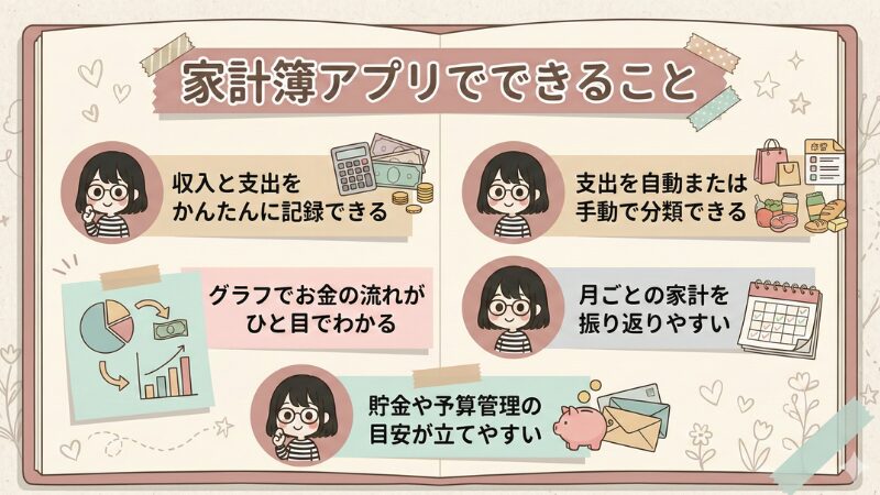 家計簿アプリを使ってできることは、以下のとおりです。