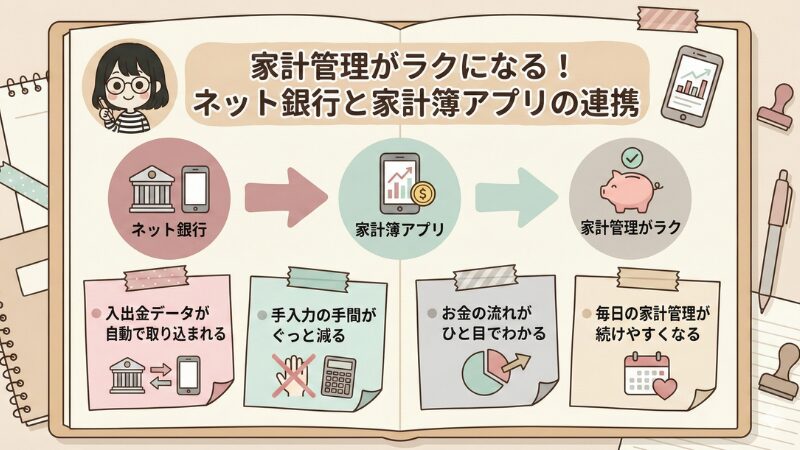 ネット銀行と家計簿アプリの連携で、家計管理がラクになるよ。