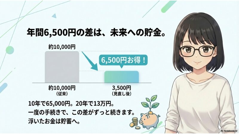年間6,500円と聞くと、一見小さい金額に見えますが、10年、20年…と考えると、大きな差が出ます。
