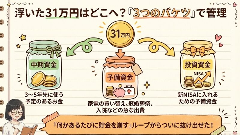 今までは、急な出費に備える中期資金を用意していなかったので、何かあるたび貯金を崩して使っていました。