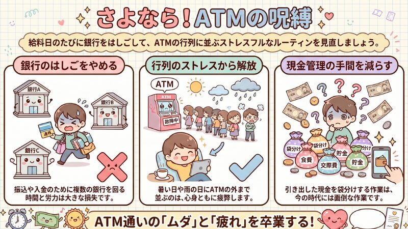 今考えると、毎月、お金を下ろしに並ぶ時間、手数料は無料でも「時間単価」を考えたら大赤字です。