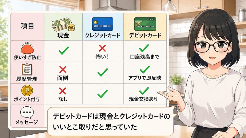 デビットカードは、「現金払い」と「クレジットカード」の中間、いいとこ取りできると思っていました。