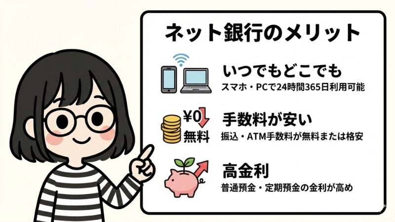 ネット銀行は実店舗がなく、スマホアプリやパソコンで24時間取引可能な銀行なんだよ。