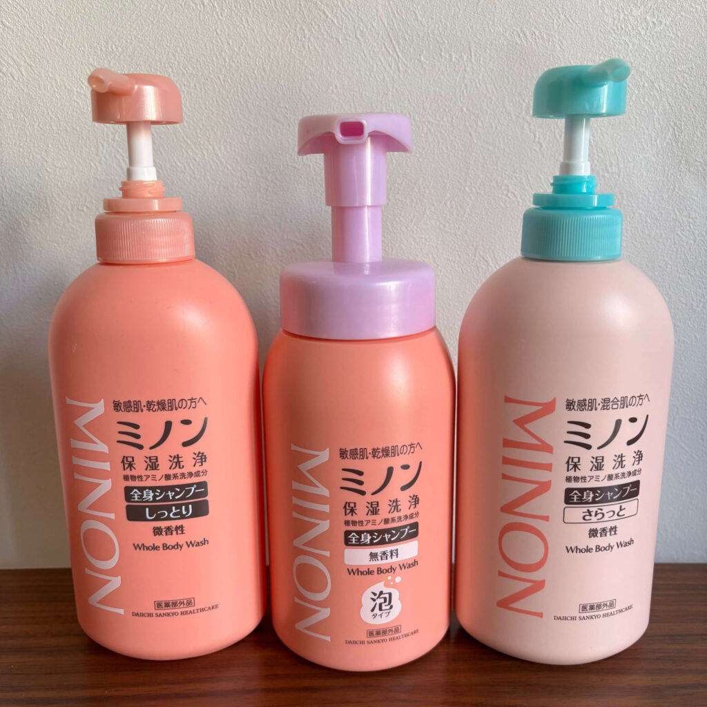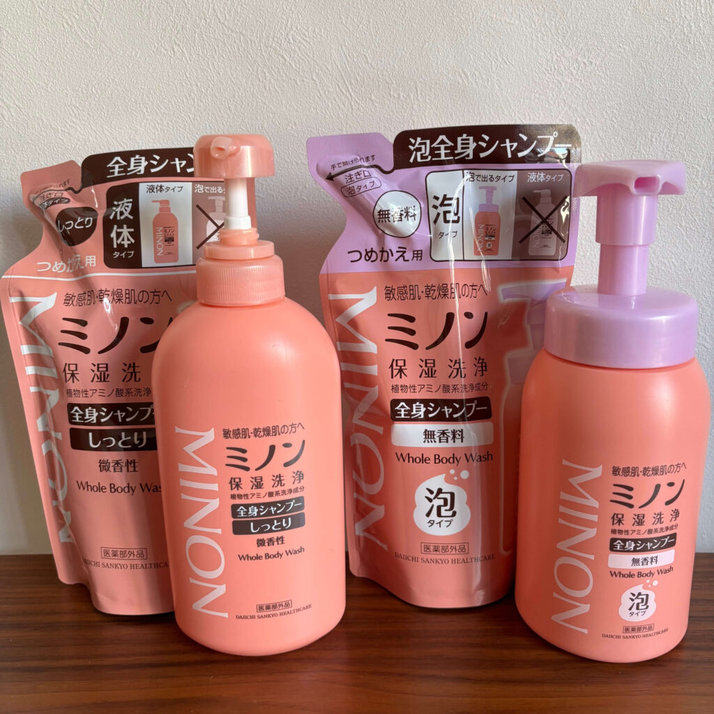 わが家は、「ミノン全身シャンプーしっとりタイプ」と「ミノン全身シャンプー泡タイプ」の2本を使ってます。