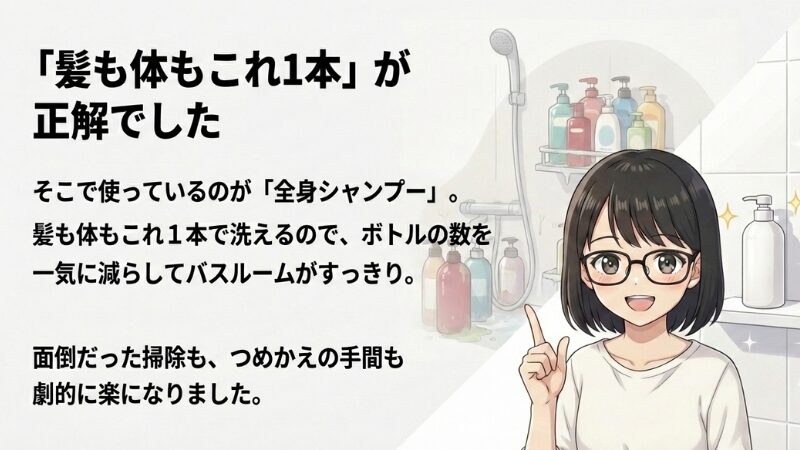 髪も体もこれ1本で洗えるので、ボトルの数を減らしてバスルームがすっきり、掃除もつめかえの手間も楽になりました。