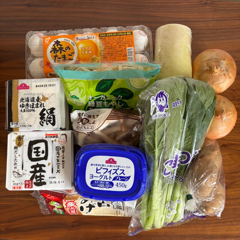 固定の買いものリストは、玉子、豆腐、野菜など使いやすいものだけです。