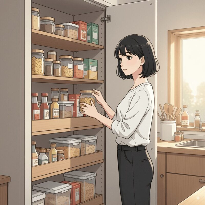 ごま油やオリーブオイル→米油で代用、コンソメ→和風だしで代用、鷹の爪→七味唐辛子を使うなど、少ない調味料を使いまわしています。